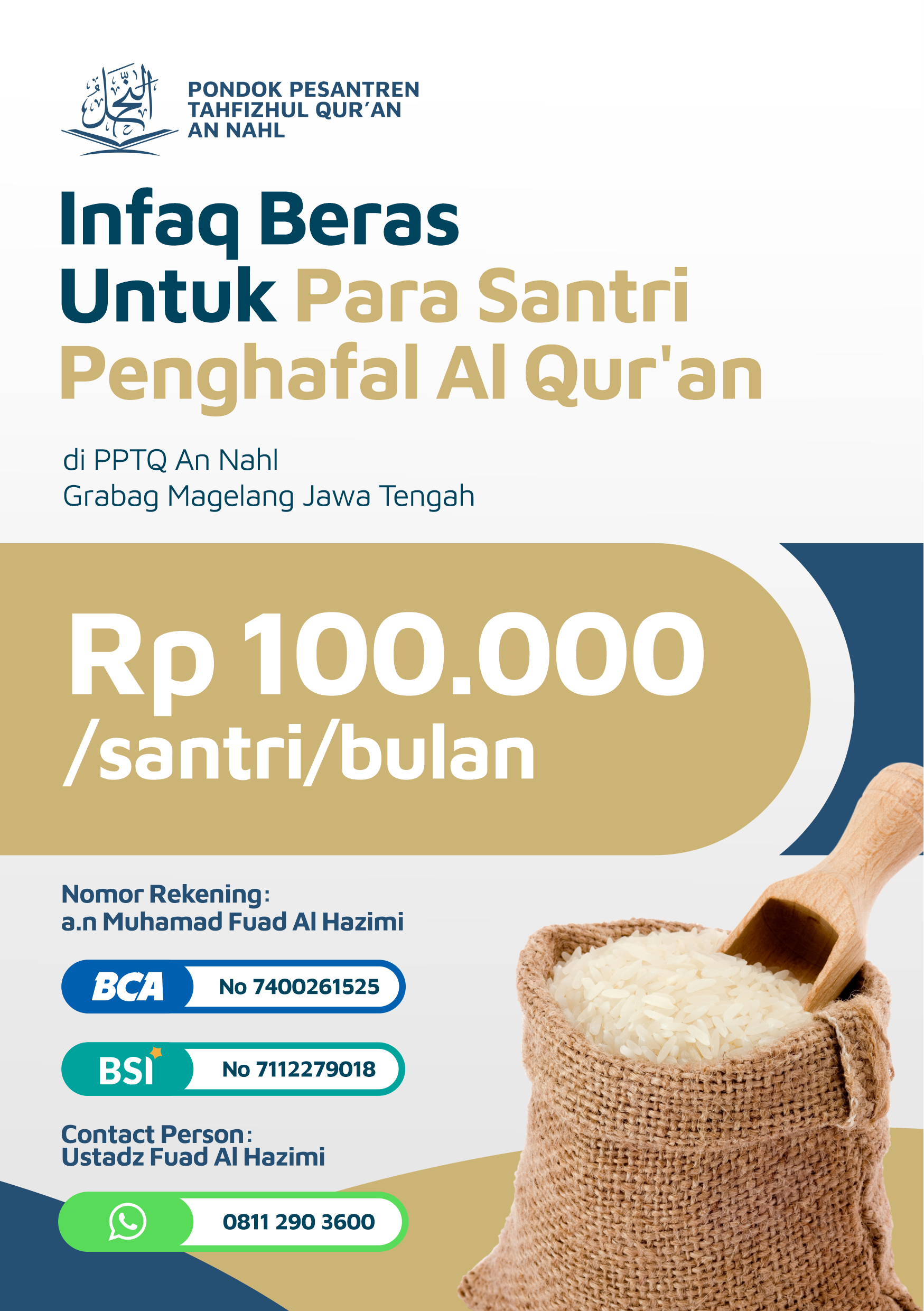 INFAQ BERAS UNTUK PARA SANTRI PENGHAFAL AL QUR'AN DI PPTQ AN NAHL GRABAG MAGELANG Rasulullah shallallahu ‘alaihi wasallam bersabda, “Barangsiapa yang membaca satu huruf dari kitab Allah (Al Qur’an), maka baginya satu kebaikan, dan satu kebaikan itu dibalas sepuluh kali lipat. Saya tidak mengatakan ‘Alif Lam Mim’ satu huruf, tetapi ‘Alif’ satu