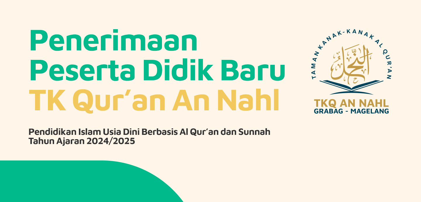 Penerimaan Peserta Didik Baru (PPDB) TK Al Qur’an An Nahl Pendidikan Islam Usia Dini Berbasis Al Qur’an dan Sunnah Tahun Ajaran 2024/2025 Bismillahirrahmanirrahim Anak adalah anugerah Allah Ta’ala sekaligus amanah yang harus dikembangkan potensinya dengan optimal agar menjadi anak sholih dan sholihah yang berdaya guna dan berprestasi. Anak juga merupakan aset bagi kedua orang tua