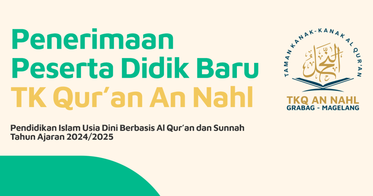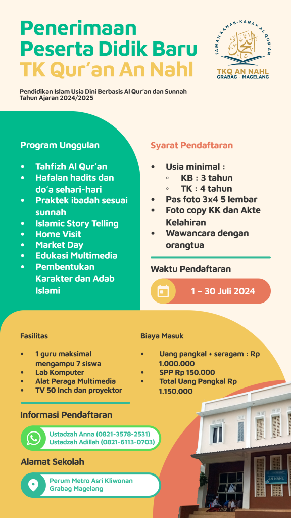Setelah 10 tahun berdiri, Pondok Pesantren Tahfizhul Qur’an An Nahl yang saat ini memiliki unit Pendidikan SDTQ An Nahl untuk Pendidikan Tingkat dasar dan PPTQ An Nahl Putra/Putri untuk jenjang Pendidikan Tingkat lanjutan, mulai tahun ajaran 2024/2025 ini akan membuka unit pendidikan pra sekolah berbasis Al Qur’an dan sunnah yaitu Taman Kanak-kanak Al Qur’an An Nahl atau disingkat menjadi TKQ An Nahl. Dengan didirikannya unit Pendidikan pra sekolah ini kami berharap adanya kesinambungan metode pengajaran dan kurikulum yang selama ini diterapkan di An Nahl yaitu kurikulum berbasis Al Qur’an yang mengutamakan itqan atau hafalan yang melekat kuat dan tidak mudah hilang serta pembentukan akhlak dan adab anak didik dengan panduan hadits-hadits nabi yang dihafalkan di luar kepala sehingga tarbiyah nabi ini tertanam di dalam sanubari anak didik.