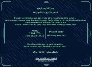 Wisuda ini akan diselenggarakan pada hari Ahad 5 Mei 2019. Acara ini akan dilaksanaan di Masjid Jami’ Al Muqorobien, mulai pukul 08.00 WIB hingga selesai.