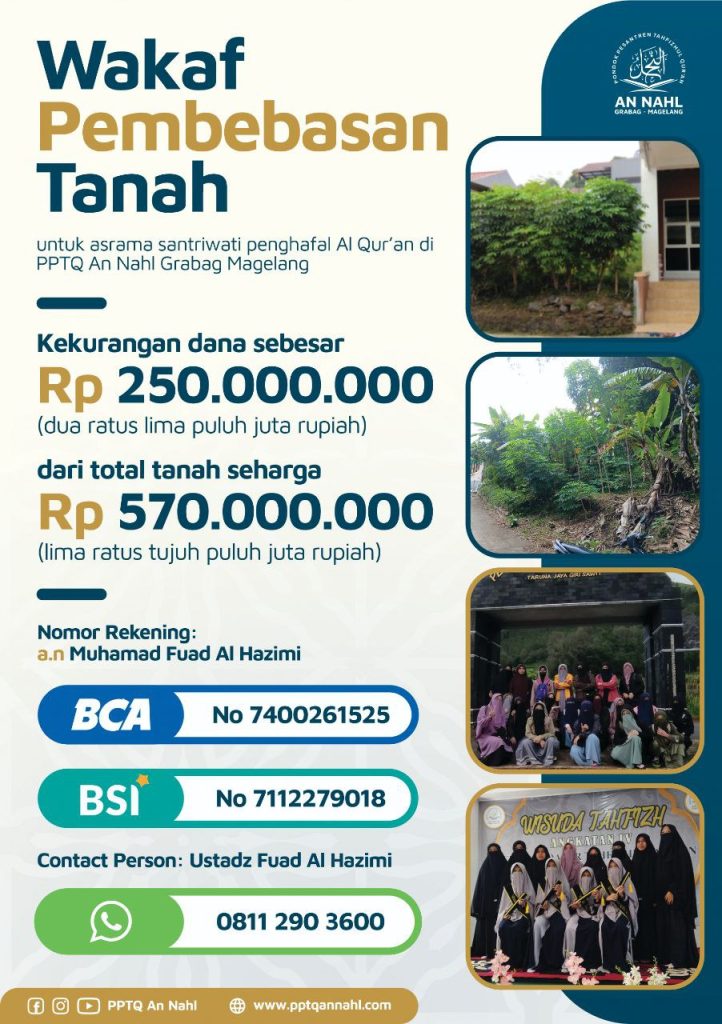 Pondok Pesantren Tahfizhul Qur’an (PPTQ) An Nahl Grabag Magelang mengajak kaum muslimin semua untuk mengalokasikan zakat, infaq wakaf dan shodaqohnya tahun ini guna pembebasan tanah yang akan kami manfaatkan untuk asrama dan kelas santriwati  Pondok Pesantren Tahfizhul Qur’an (PPTQ) An Nahl putri ini, semoga Allah Melipatgandakan imbalan dari Nya di dunia dan di akhirat serta menjadikan ziswaf dari bapak dan ibu sebagai amal jariyah yang pahalanya terus mengalir hingga hari kiamat untuk bapak dan ibu serta semua keluarga, baik yang masih hidup maupun yang sudah menghadap Allah Ta’ala, khususnya untuk kedua orangtua bapak dan ibu kaum. Jazaakumullohu khoiron